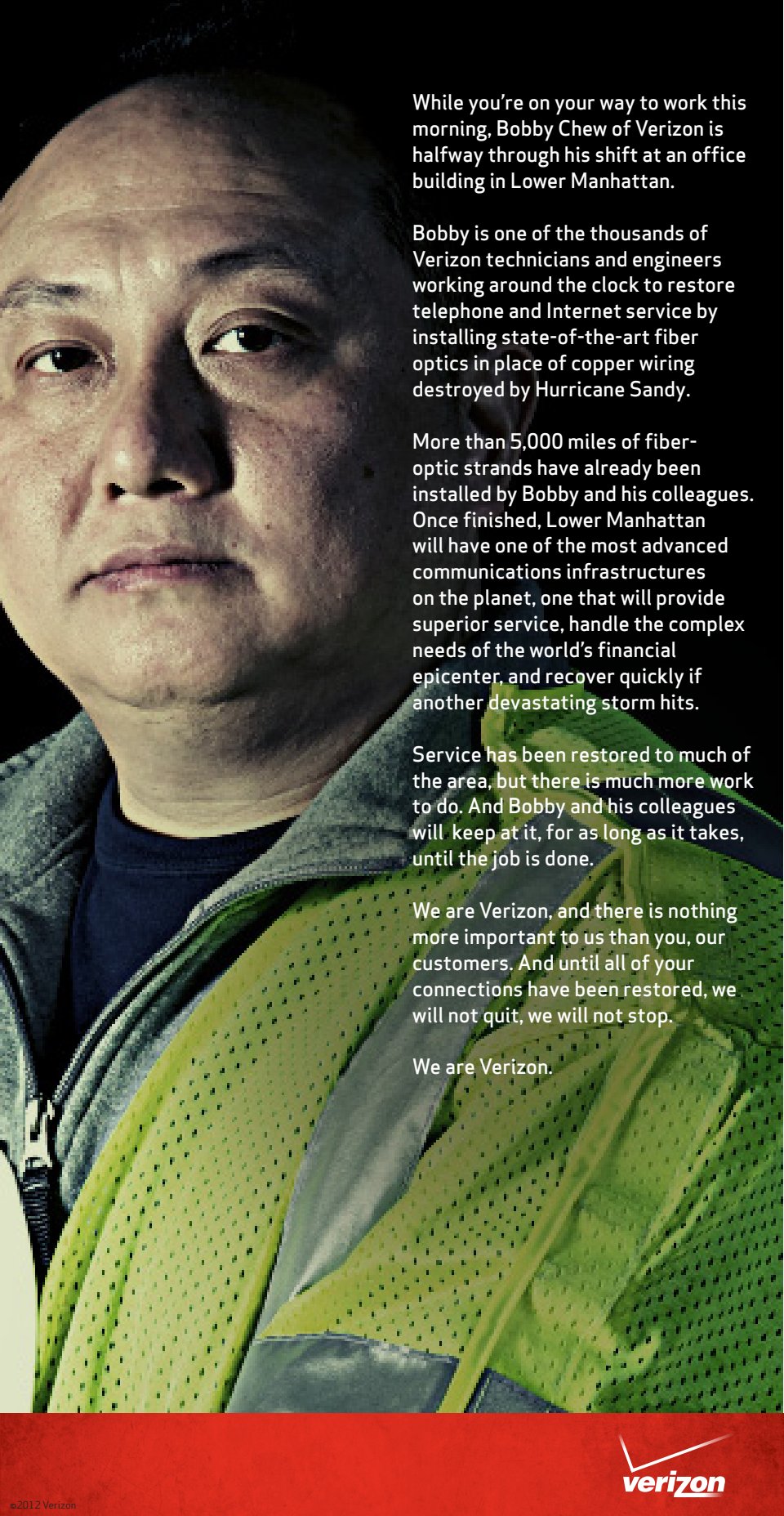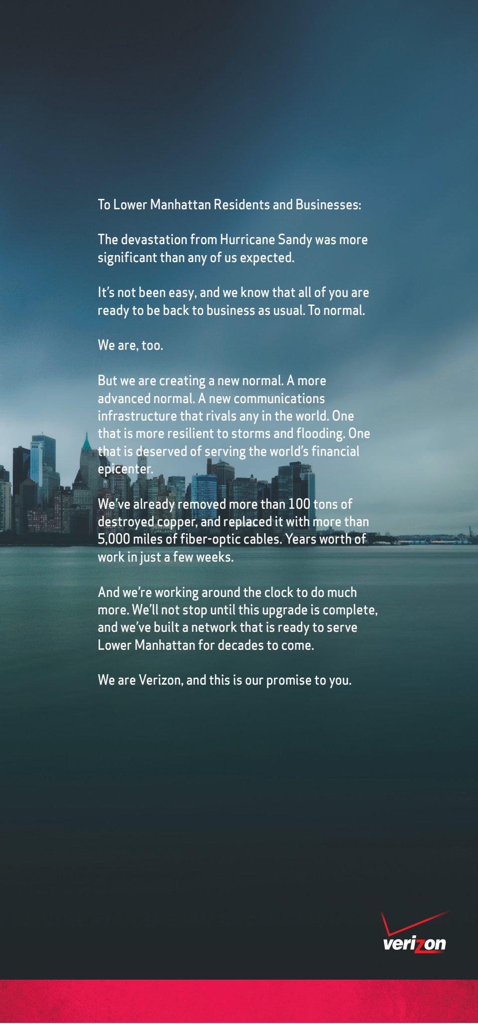 Mayor Bloomberg criticized Verizon publicly for not moving fast enough, prompting them to respond with a series of full page ads in the New York Times, Wall Street Journal and elsewhere about the extent of their work getting the phones working again.